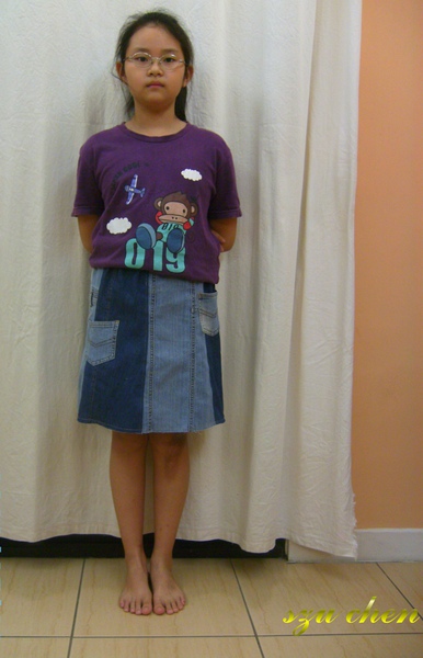 這是拼接的牛仔裙,不過還沒完工,先行試穿
