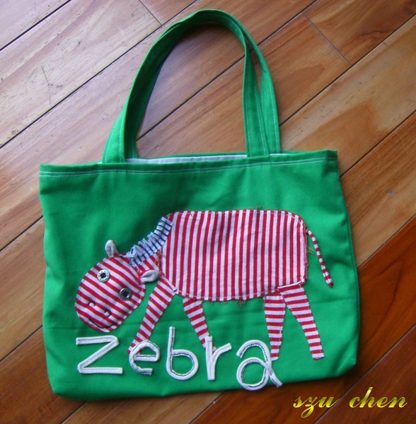 我婆婆給的零頭布,因為顏色鮮綠,很適合小朋友,所以做成小提袋.