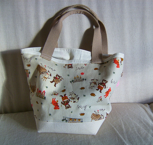 趁著某日上午空閒到永樂市場逛,上樓第一攤就看到這塊動物樂團的布,恰好兒子喜歡狗的圖案,且他的便當袋也破損,就幫他做了個新的,兒子看了很開心也很喜歡.