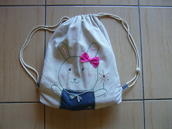 妹設計的兔娃娃,將它做成後背袋,可愛ㄛ!