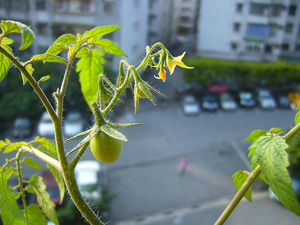 我把每朵小黃花互相授粉,花謝之後子房澎脹,結成綠綠的小蕃茄