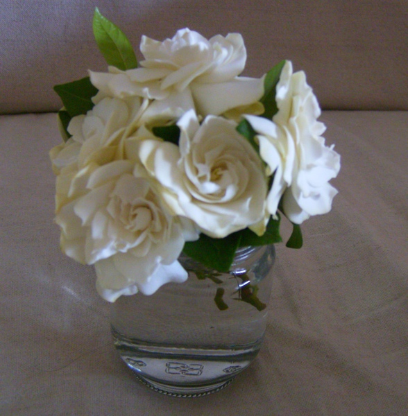 插在小小玻璃瓶中,有點像玫瑰,是實上是香味濃郁的梔子花.