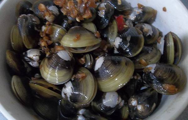 4. 大蒜,辣椒切末放入瀝乾的蜆,最後倒入醬油拌勻即可