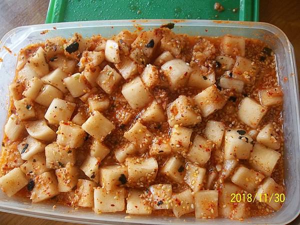 蘿蔔切丁用鹽醃一小時,剩餘作法同黃豆芽泡菜,不加蝦皮歐